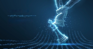 Chess knight in digital hand beats the kind. Win of AI, chess strategy, digital manager, business competition, innovation challenge, AI assistant, political checkmate, technological success concept.
